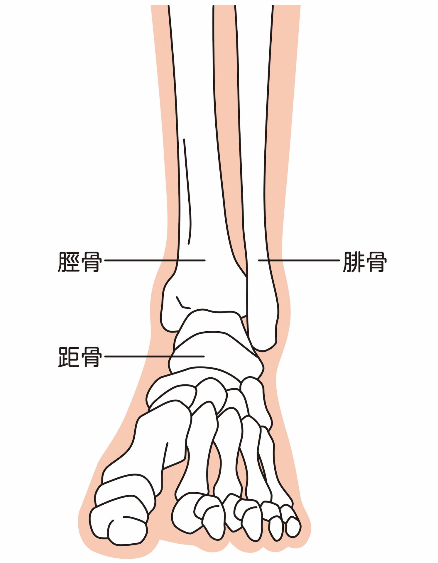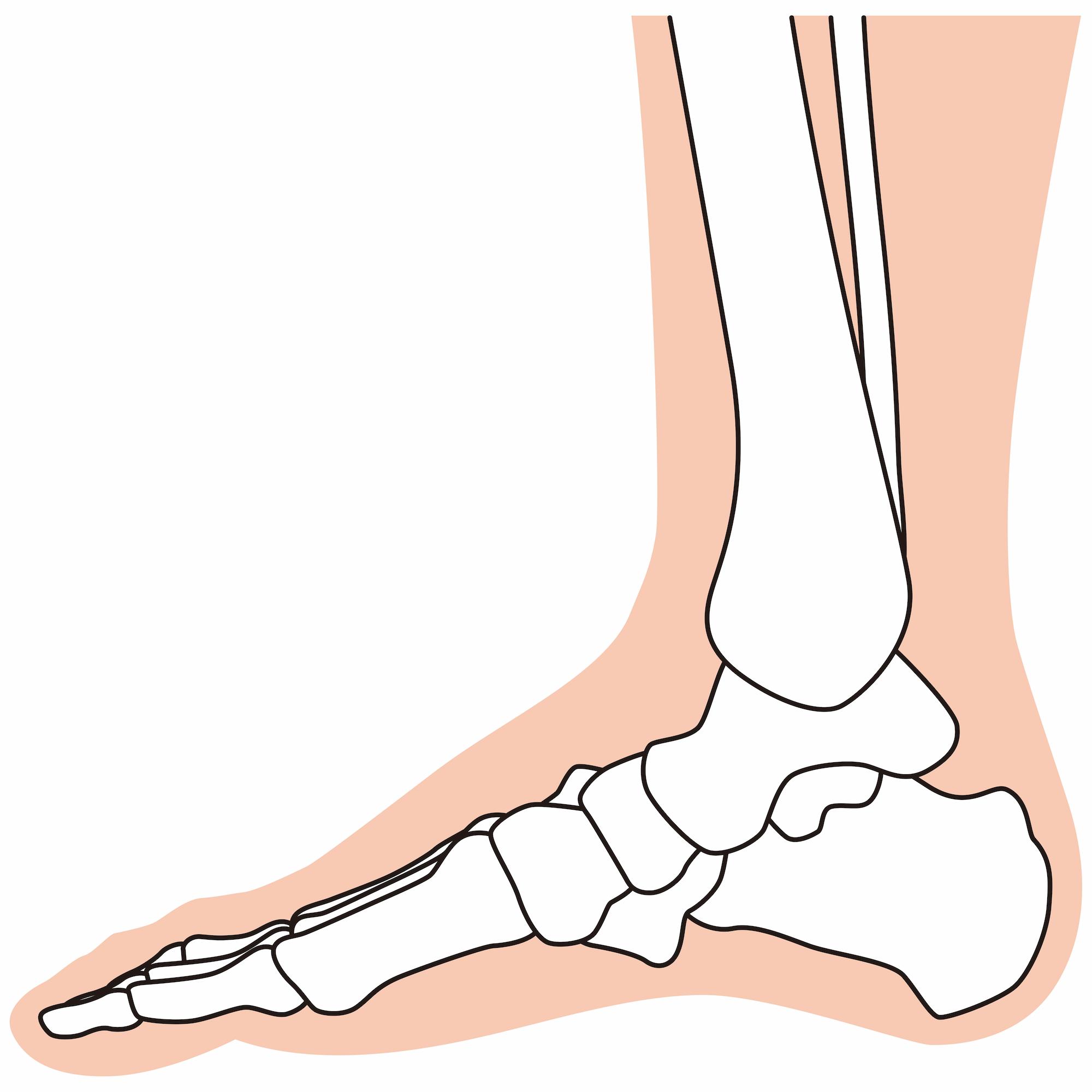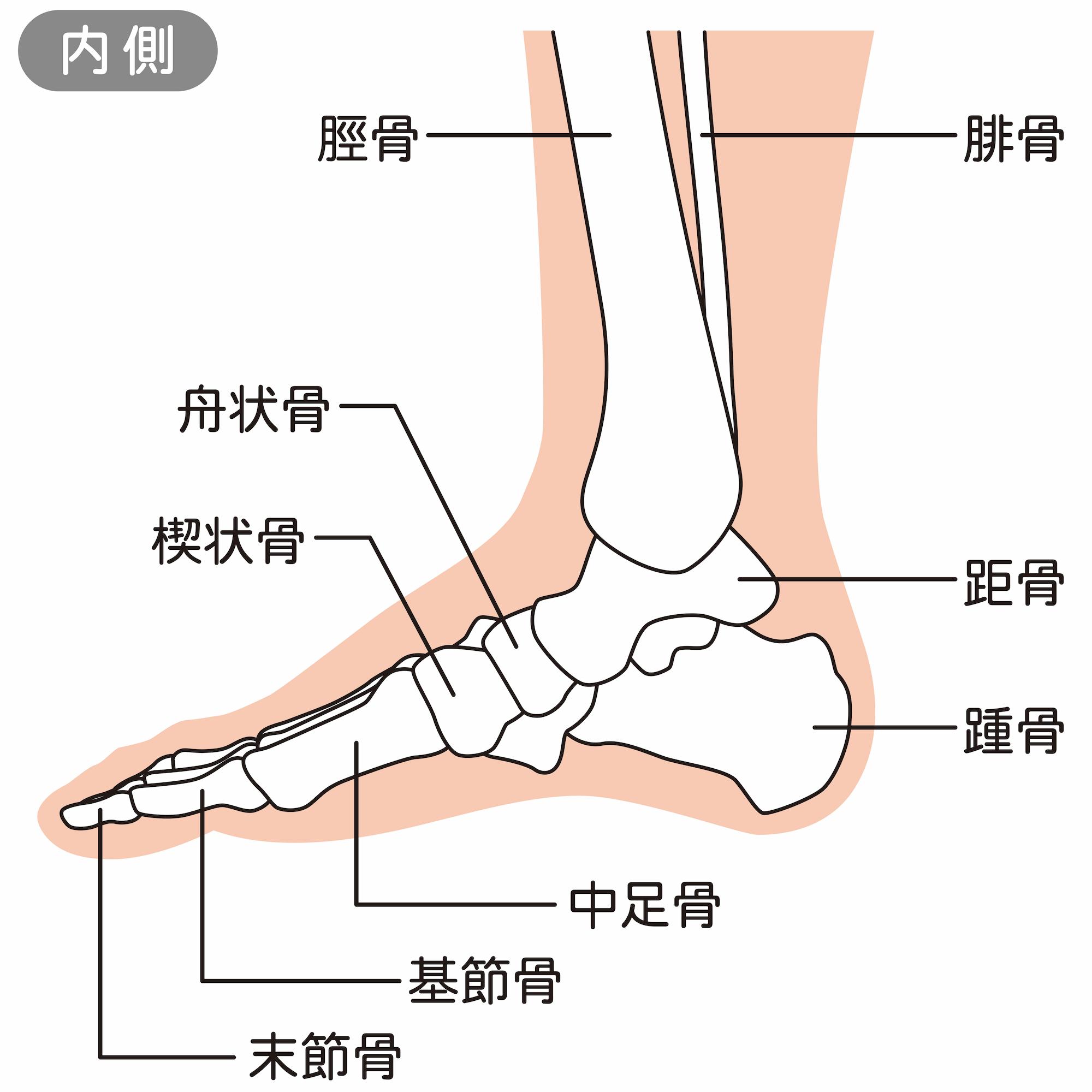 足関節とは、一般的に足首と呼ばれている箇所のことです。かかとの上にある距骨(きょこつ)、すねの骨である脛骨(けいこつ)、その外側を平行する腓骨(ひこつ)の3つの骨から構成されています。周囲は軟骨(なんこつ)や靭帯(じんたい)に覆われており、つま先を上下に動かしたり、足と体をつなぐ役割を果たしています。足関節のつくりについて、それぞれの役割をみていきましょう。