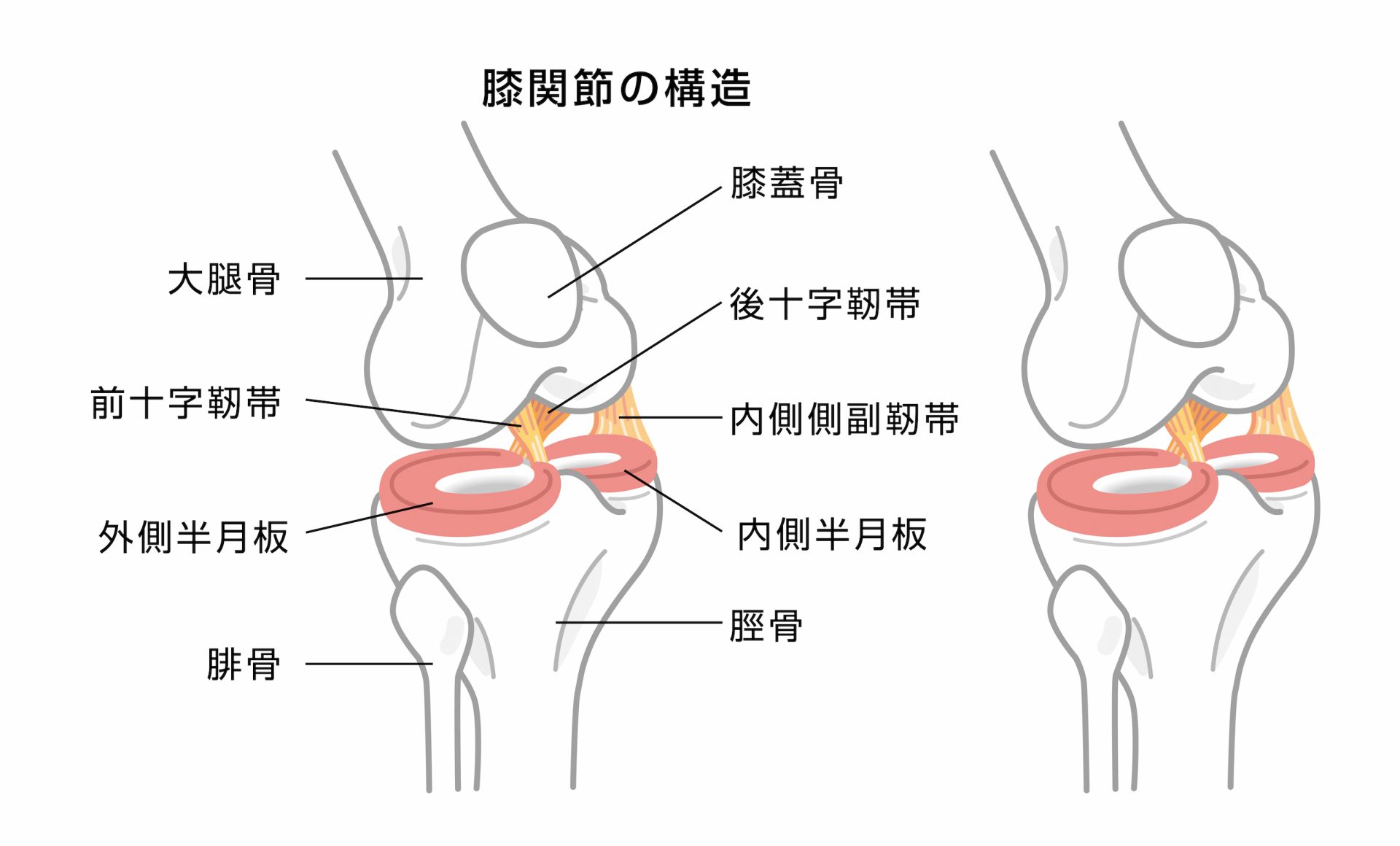 ひざの両側には2本の「側副靭帯(そくふくじんたい)」、関節内部の前後にはそれぞれ「前十字靭帯(ぜんじゅうじじんたい)」「後十字靭帯(こうじゅうじじんたい)」があります。